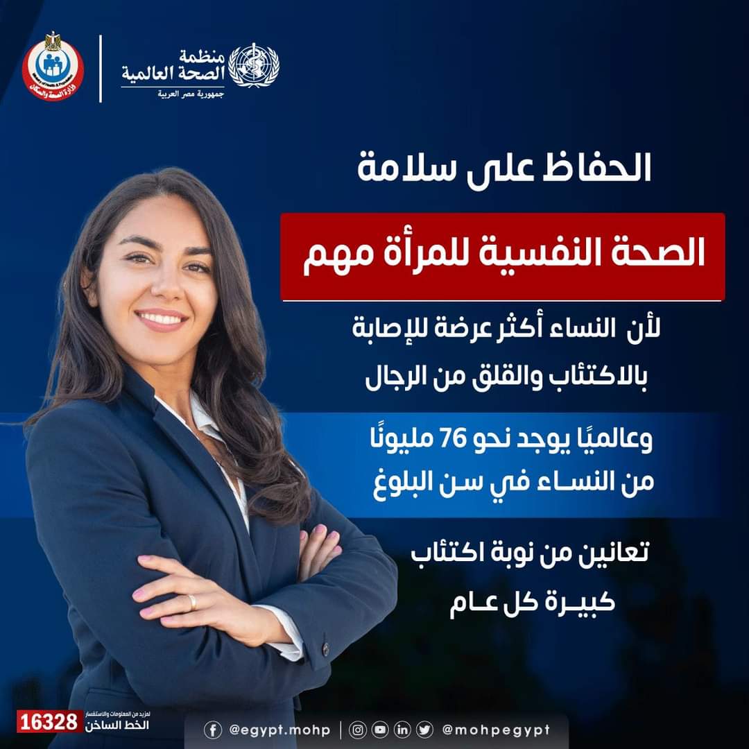 وقالت الوزارة إنه عالميًا يوجد حوالي ٧٦ مليونًا من النساء في سن البلوغ تعانين من نوبة اكتئاب كبيرة كل عام