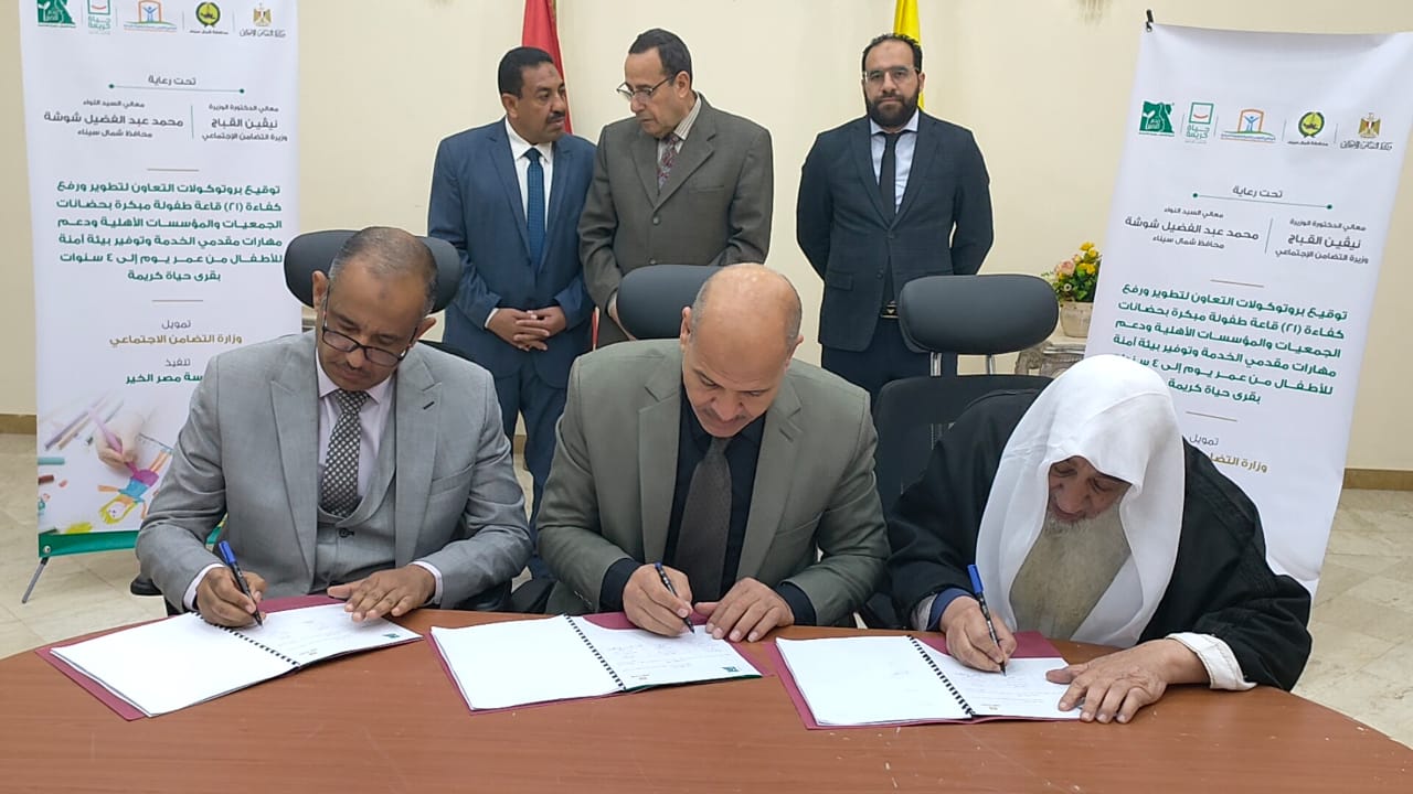 شهد اللواء دكتور محمد عبد الفضيل شوشة محافظ شمال سيناء،توقيع بروتوكولتعاون مشترك بين مديرية التضامن الاجتماعي بالمحافظة ومؤسسة مصر الخير، لتطوير 21 قاعة حضانة على مستوى المحافظة،بهدف رفع كفاءة الحضانات وتوفيق أوضاعها ودعم مهارات مقدمى الخدمة وتوفير بيئة آمنة للأطفال من عمر يوم إلى 4 سنوات بمشاركة عدد من الجمعيات الأهلية.