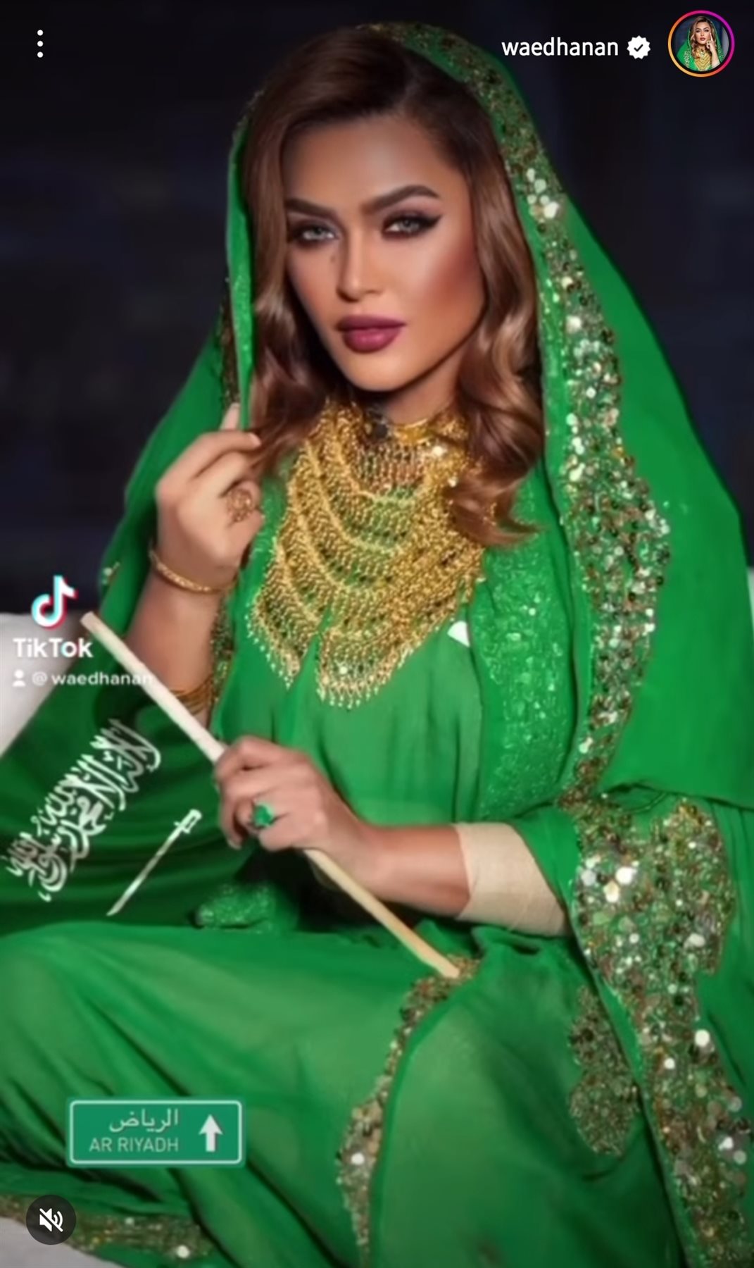 وظهرتالمطربة وعد،بالزي التقليدي السعودي باللون الاخضر وبأكمام طويلة، وأختارت حجاب بنفس اللون على شعرها، وهو ما أعطاها إطلالة ناعمة وجذابة.