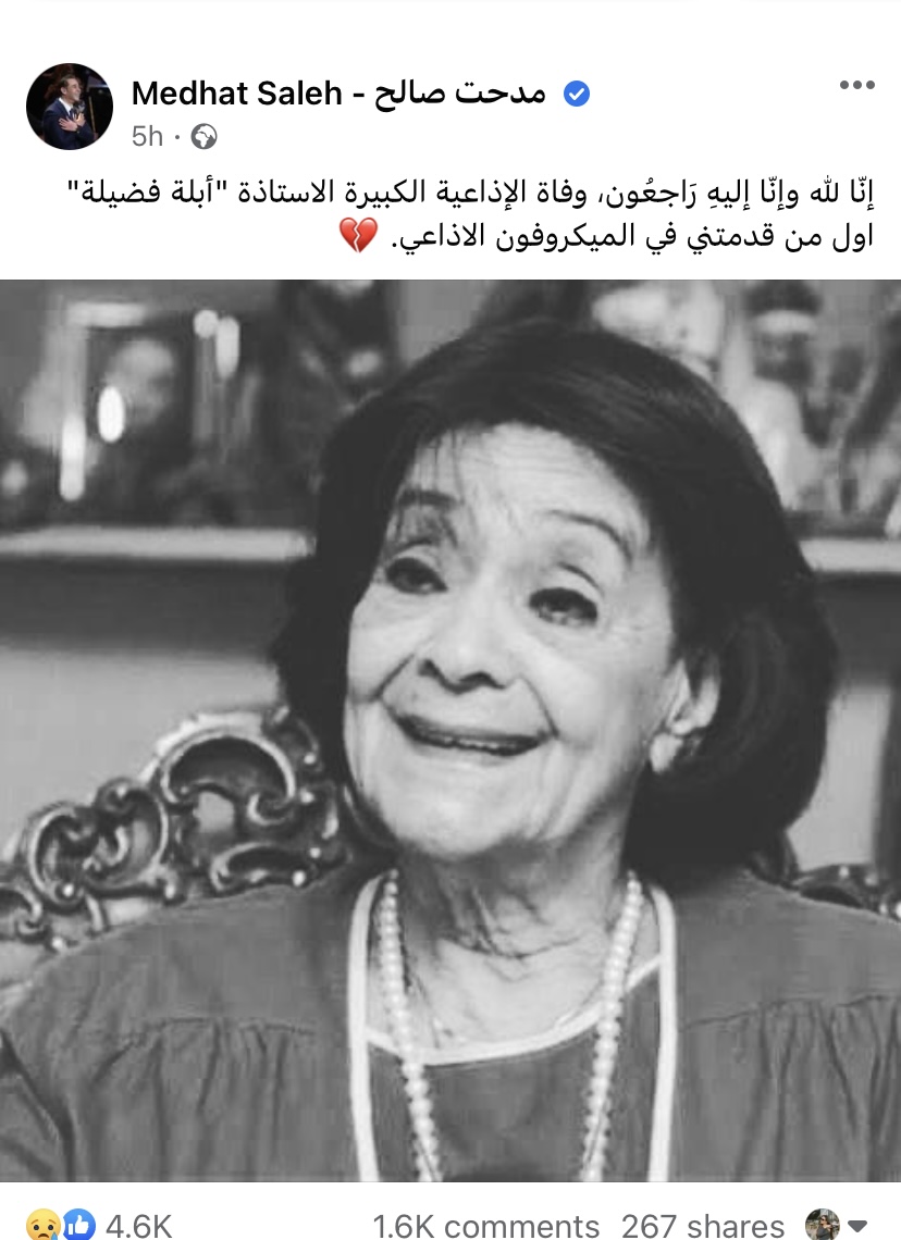 وكتب مدحت صالح "إنّا لله وإنّا إليهِ رَاجعُون، وفاة الإذاعية الكبيرة الاستاذة "أبلة فضيلة" اول من قدمتني في الميكروفون الاذاعي.".