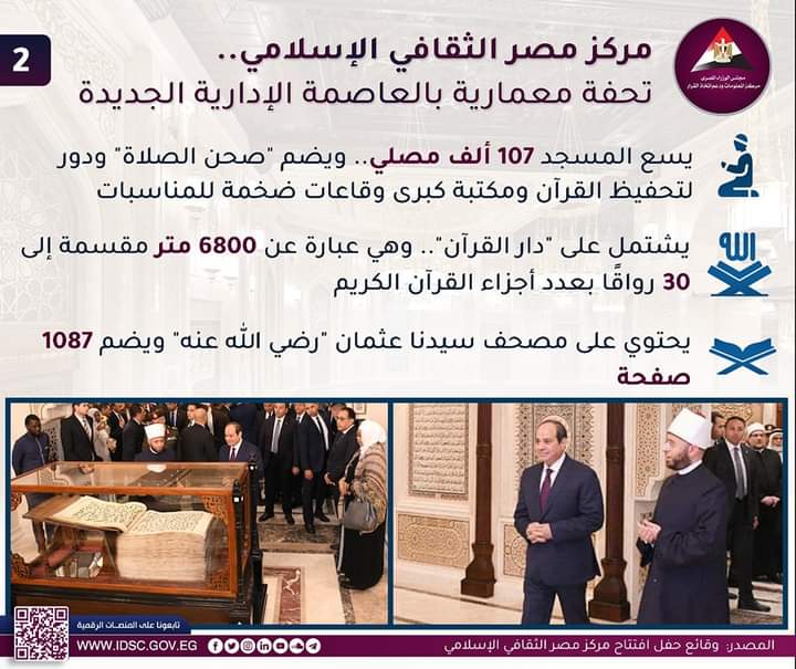 وقال المركز إنه في أولى ليالي شهر رمضان المبارك، افتتح الرئيس عبد الفتاح السيسي، المركز الثقافي الإسلامي، أو كما يعرف باسم "مسجد مصر الكبير"، كأحد أكبر المساجد على مستوى العالم، والذي بُني على أعلى نقطة بالعاصمة الإدارية الجديدة.