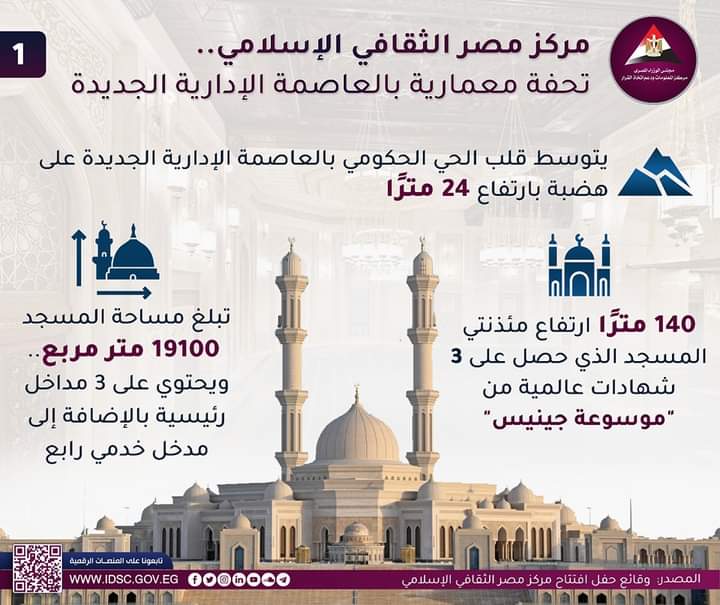 نشر مركز المعلومات ودعم اتخاذ القرار بمجلس الوزراء “إنفوجراف” عبر صفحته الرسمية على موقع التواصل الاجتماعي فيس بوك بشأن مسجد مصر بالعاصمة الإدارية الجديدة.