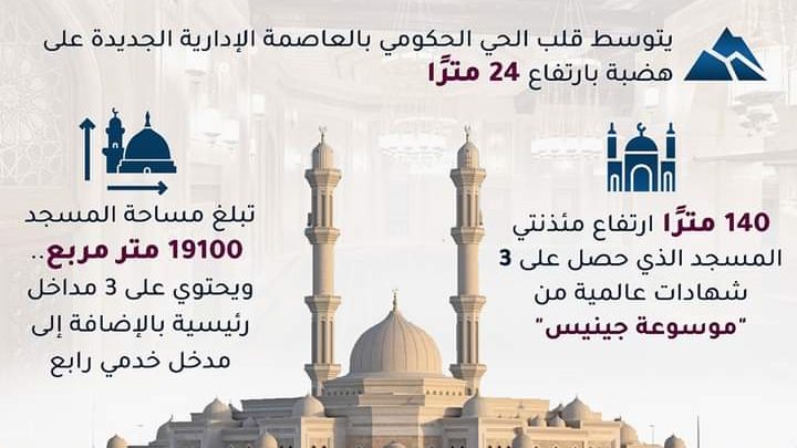 وتابع الانفوجراف أن المسجد يتوسط قلب الحي الحكومي بالعاصمة الإدارية الجديدة على هضبة بارتفاع 24 مترا .