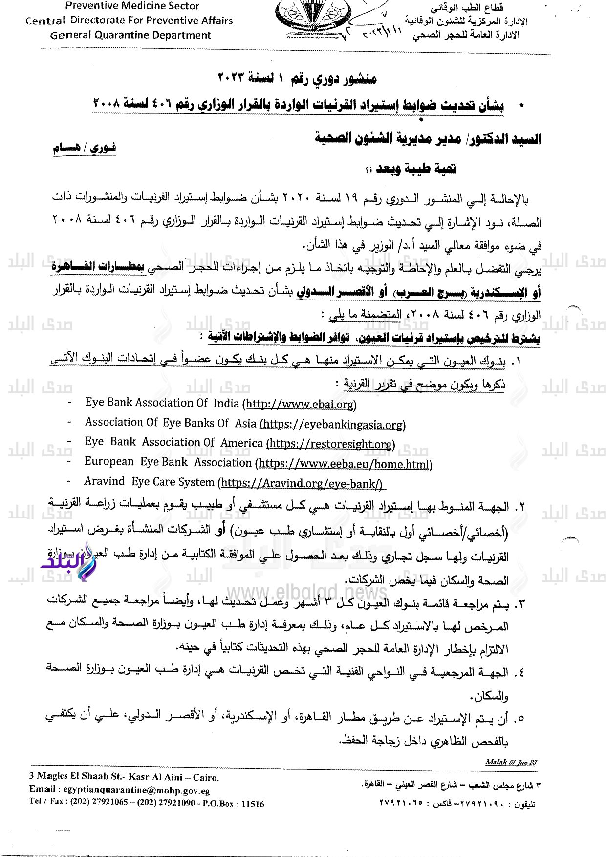 بالإحالة إلي المنشـور الـدوري رقم 19 لسنة ٢٠٢٠ بشأن ضوابط إستيراد القرنيسات والمنشورات ذات الصلة، نود الإشارة إلـي تحـديث ضـوابط إستيراد القرنيـات الواردة بالقرار الوزاري رقم 406 لسنة ٢٠٠٨