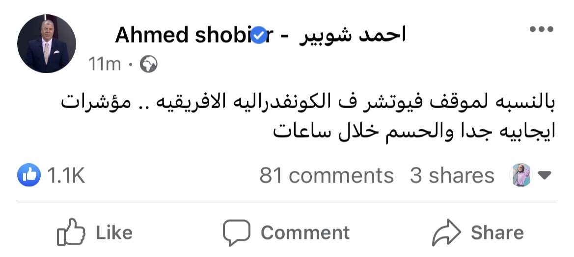 وكتب: "بالنسبه لموقف فيوتشر ف الكونفدراليه الافريقيه .. مؤشرات ايجابيه جدا والحسم خلال ساعات".