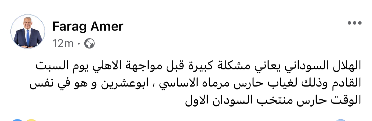 وكتب فرج عامر في منشور له: “الهلال السوداني يعاني مشكلة كبيرة قبل مواجهة الاهلي يوم السبت القادم لغياب حارس مرماه الاساسي ، ابوعشرين و هو في نفس الوقت حارس منتخب السودان الاول”.