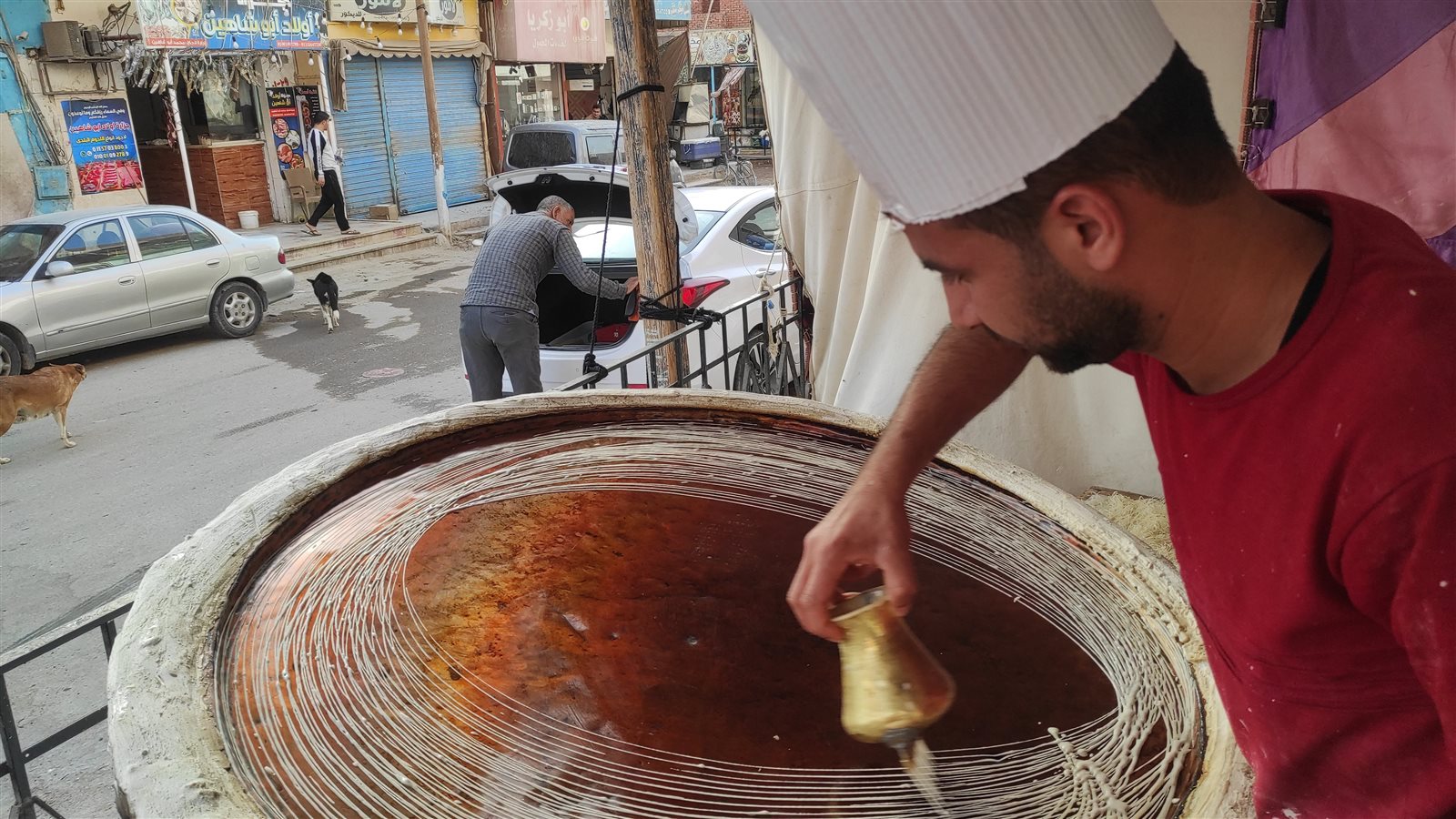 - نبدأ بتشكيل الكنافة بتحريك الكيس أو الزجاجة في شكل دوائر.