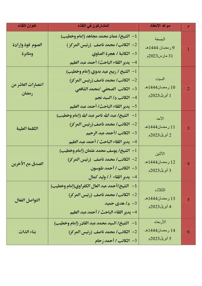 وأعلنت الأوقاف عن انطلاق فعاليات الصالون التثقيفي في محبة الوطن "حدوتة رمضانية" بالحديقة الثقافية للأطفال خلال ليالي الشهر الفضيل، إسهامًا من الوزارة في بناء الوعي الديني والوطني والقيمي لدى أبنائنا وبناتنا ، وذلك في تمام الساعة التاسعة مساءً عقب صلاة التراويح وفق الجدول الآتي :
