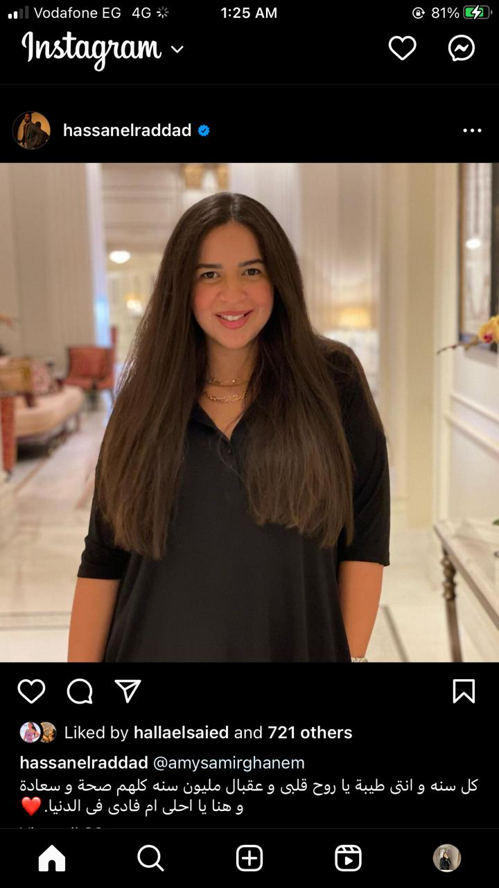 وشارك حسن الرداد صورة للفنانه ايمي في أحدث ظهور، وكتب: "كل سنه وانتي طيبه ياروح قلبي وعقبال مليون سنهكلهم صحة وسعادة وهنا يا احلي ام فادي في الدنيا".