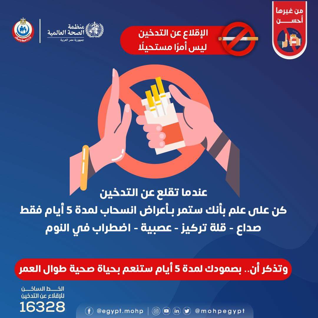 وقالت وزارة الصحة والسكان، إن الإقلاع عن التدخين ليس أمرا مستحيلا، حيث يصاب الشخص بأعراض انسحاب لمدة 5 أيام فقط من الإقلاع.