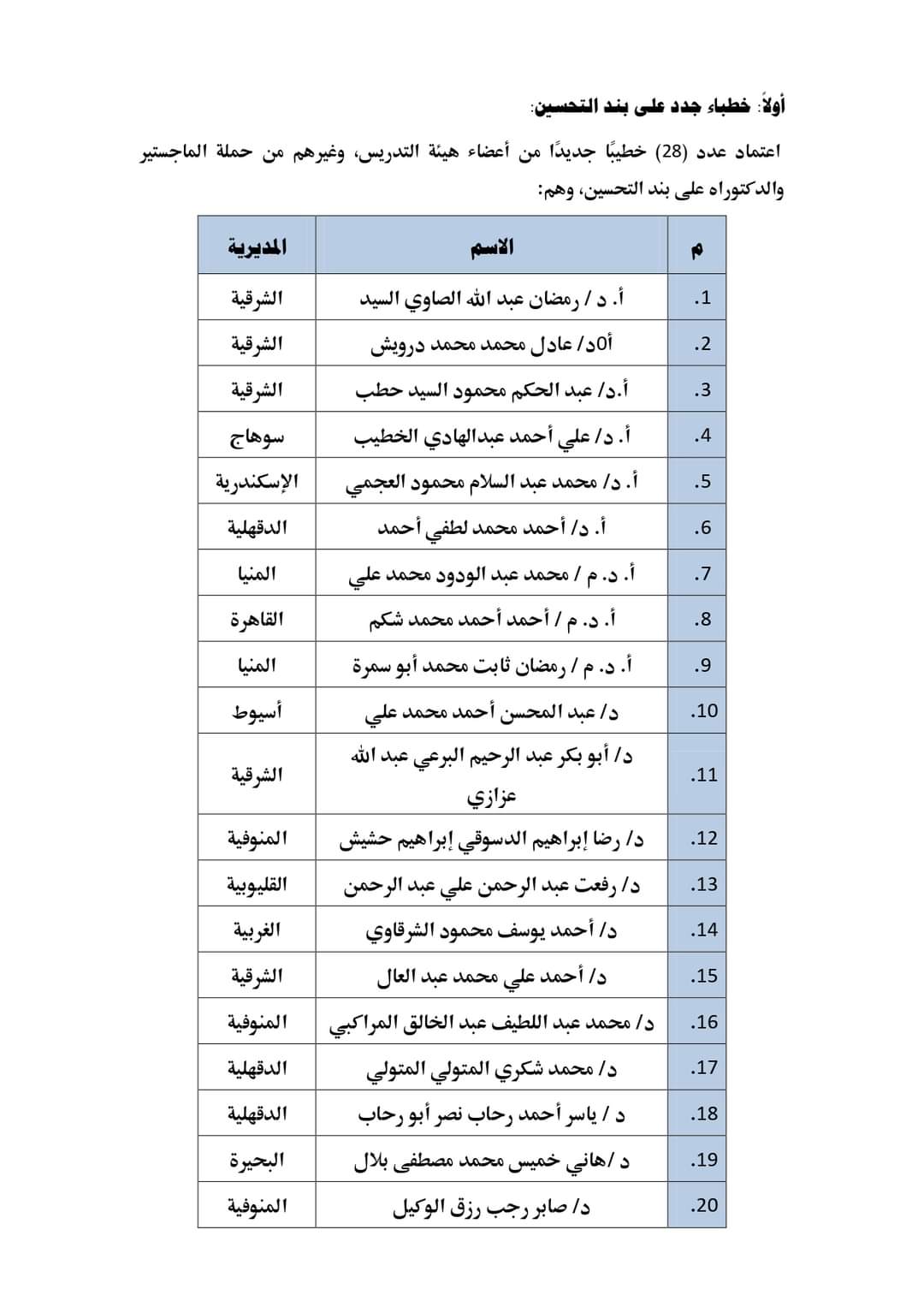 اعتمد د. محمد مختار جمعة، وزير الأوقاف، 37 خطيب مكافأة من أعضاء هيئة التدريس، وغيرهم من حملة الماجستير والدكتوراه، وذلك تفصيلاً على النحو التالي: