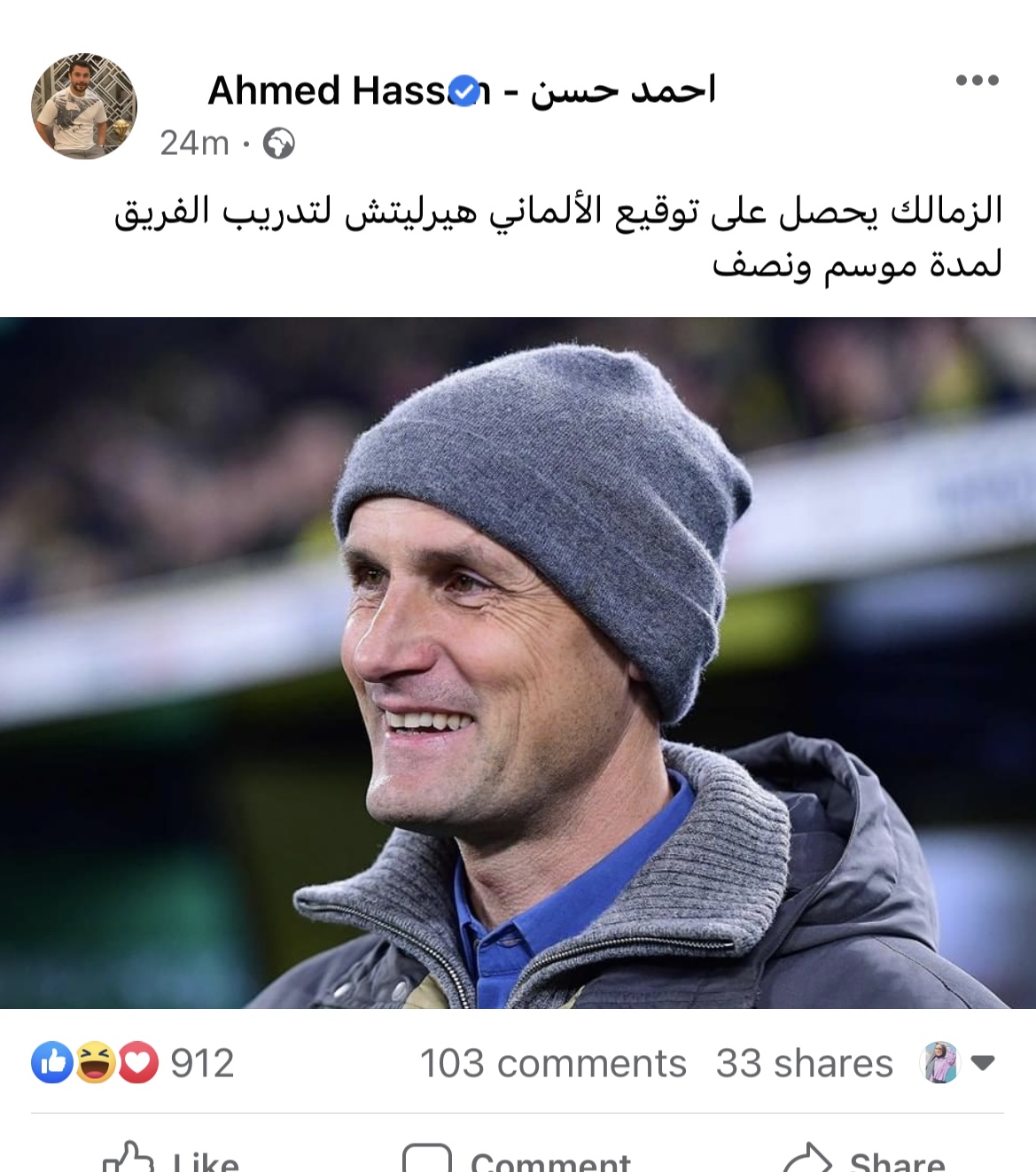 وكتب عبر فيسبوك: “الزمالك يحصل على توقيع الألماني هيرليتش لتدريب الفريق لمدة موسم ونصف”.