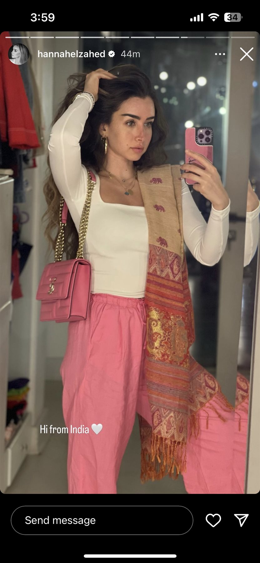 وخطفت الأنظار بلوك كاجوال، ببنطال باللون الوردي، وتوب أبيض، مع شال بطابع هندي.