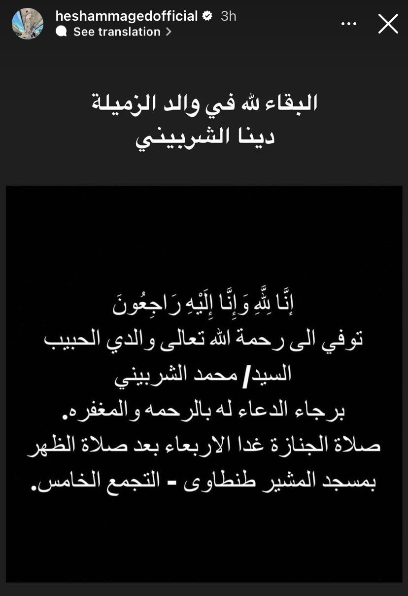 وكتب هشام ماجد عبر خاصية ستوري بحسابه بتطبيق انستجرام :"البقاء لله فى والد الزميلة دينا الشربينى".