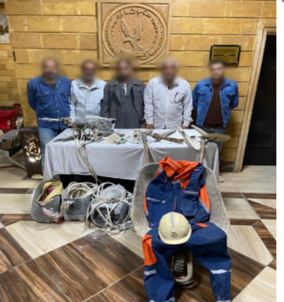 تم استهداف العقار وأمكن ضبط 5 أشخاص حال قيامهم بالتنقيب عن الآثار داخل غرفة بالطابق الأرضي بالعقار المُشار إليه "ملك أحدهم" وعُثر بداخلها على حفرة بعمق 9 أمتار ، كما تم ضبط الأدوات المستخدمة في الواقعة.