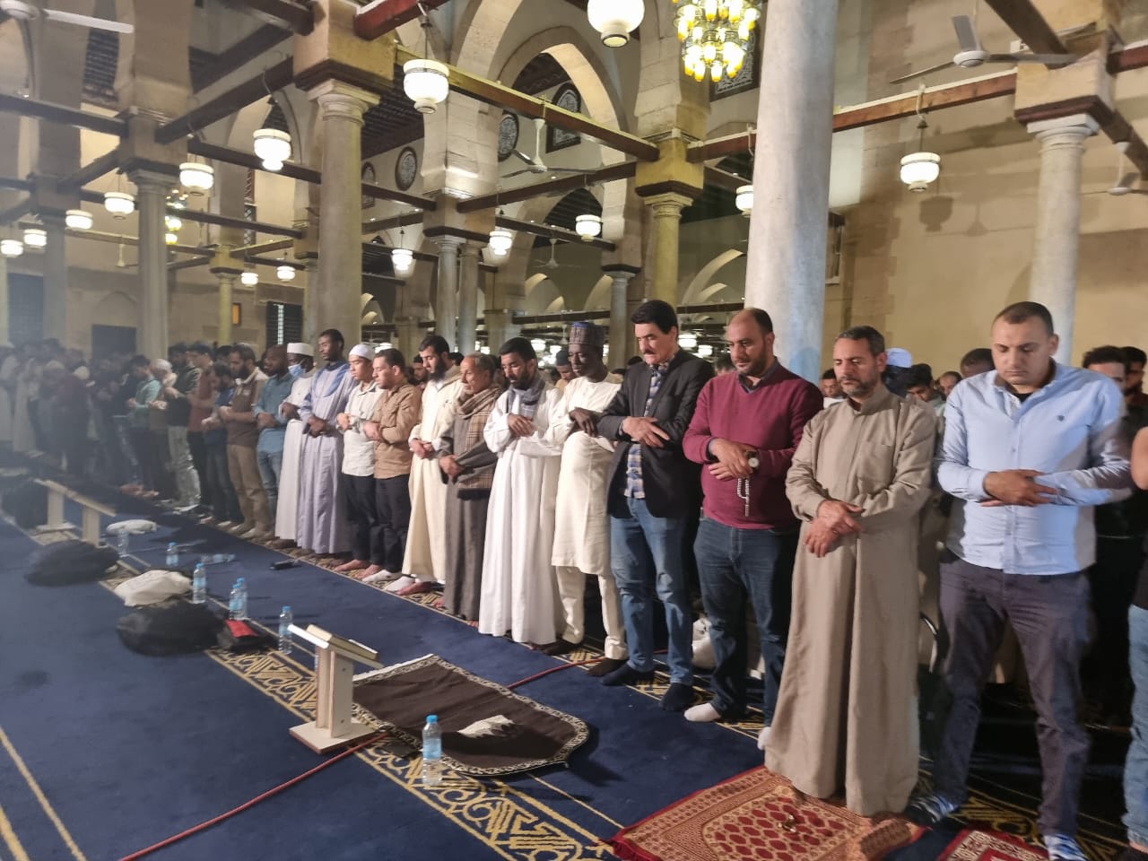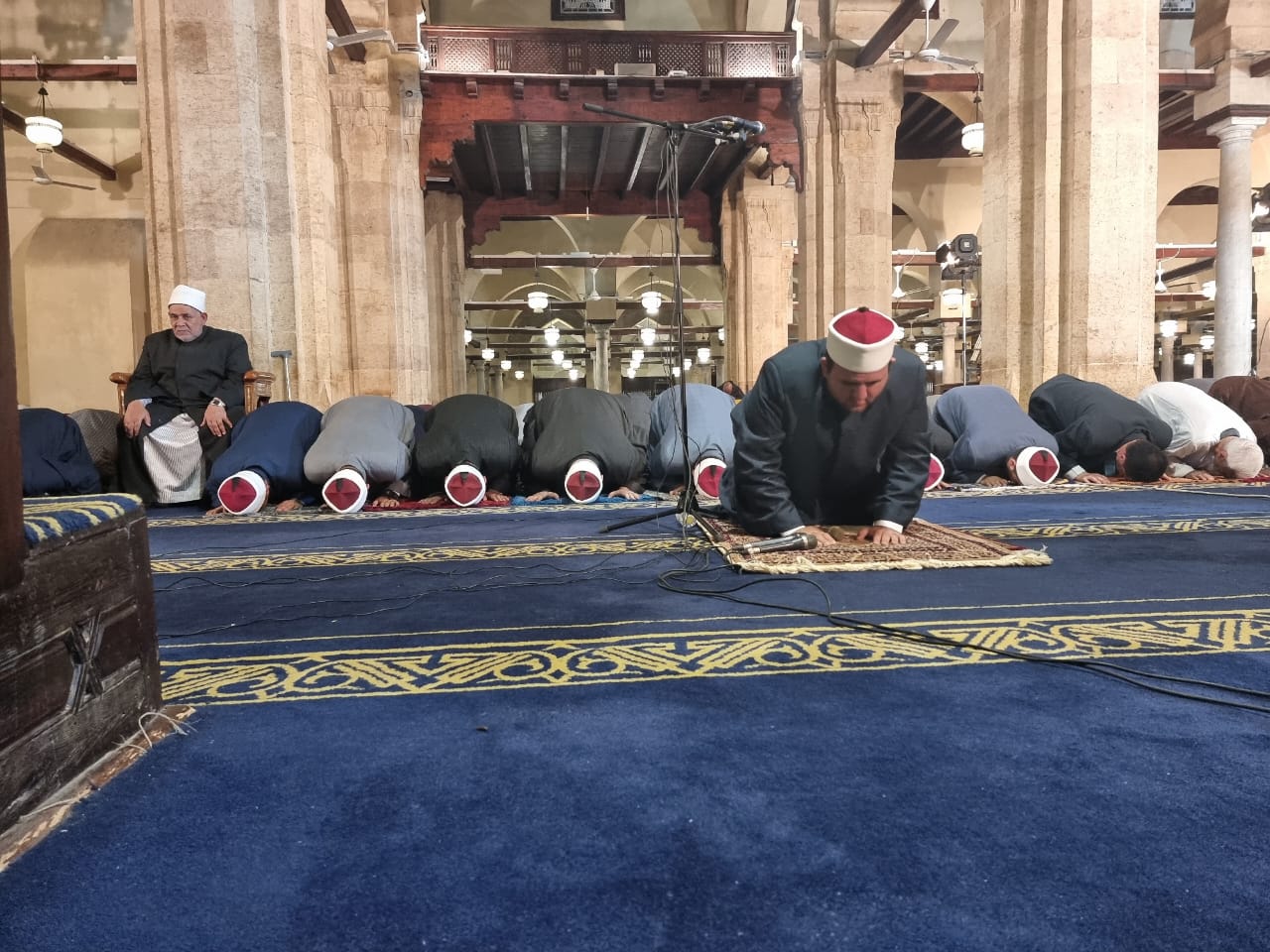 وتقدم المصلين فضيلة الدكتور محمد الضويني وكيل الأزهر، ونخبة من علماء وقيادات الأزهر الشريف، وأقيمت صلاة العشاء والتراويح بسورة الأنبياء والحج برواية حفص عن عاصم، ورواية الدوري عن أبي عمرو البصري، ورواية بن زكوان عن بن عامر الشامي، ورواية قالون عن نافع المدني.