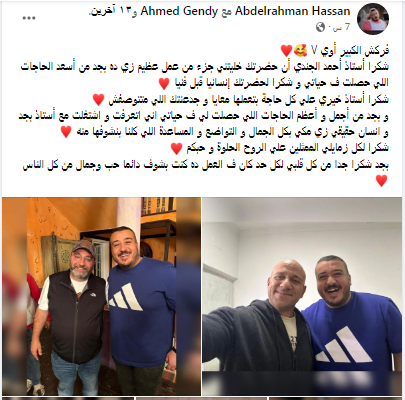 وقال عبد الرحمن حسن، في تعليقه : “فركش الكبير أوي ٧.. شكرا أستاذ أحمد الجندي أن حضرتك خليتني جزء من عمل عظيم زي ده بجد من أسعد الحاجات اللي حصلت ف حياتي و شكرا لحضرتك إنسانيا قبل فنيا .. شكرا أستاذ خيري علي كل حاجة بتعملها معايا و جدعنتك اللي متتوصفش .. و بجد من أجمل و أعظم الحاجات اللي حصلت لي ف حياتي اني اتعرفت و اشتغلت مع أستاذ بجد وانسان حقيقي زي مكي بكل الجمال والتواضع والمساعدة اللي كلنا بنشوفها منه .. شكرا لكل زمايلي الممثلين علي الروح الحلوة و حبكم.. بجد شكرا جدا من كل قلبي لكل حد كان ف العمل ده كنت بشوف دائما حب وجمال من كل الناس”.