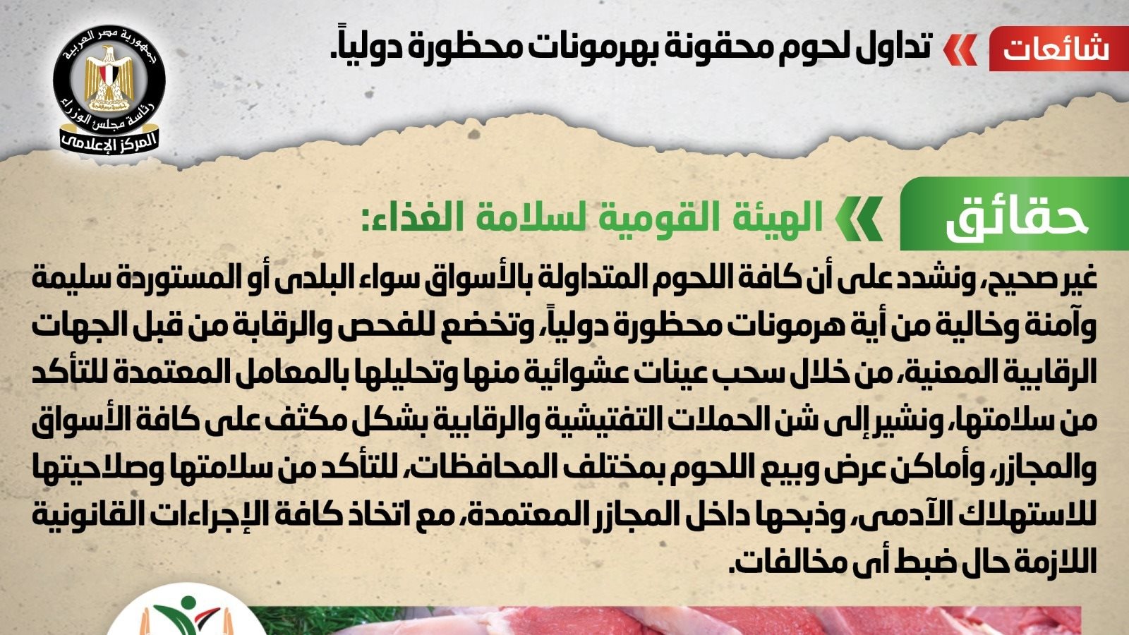 وقام المركز الإعلامي لمجلس الوزراء بالتواصل مع الهيئة القومية لسلامة الغذاء، والتي نفت تلك الأنباء، مُؤكدةً أنه لا صحة لتداول لحوم محقونة بهرمونات محظورة دولياً، مٌشددةً على أن كافة اللحوم المتداولة بالأسواق سواء البلدي أو المستوردة سليمة وآمنة وخالية من أية هرمونات محظورة دولياً، وتخضع للفحص والرقابة من قبل الجهات الرقابية المعنية، من خلال سحب عينات عشوائية منها وتحليلها بالمعامل المعتمدة للتأكد من سلامتها، مُشيرةً إلى شن الحملات التفتيشية والرقابية بشكل مكثف على كافة الأسواق والمجازر، وأماكن عرض وبيع اللحوم بمختلف المحافظات، للتأكد من سلامتها وصلاحيتها للاستهلاك الآدمي، وذبحها داخل المجازر المعتمدة، مع اتخاذ كافة الإجراءات القانونية اللازمة حال ضبط أي مخالفات.
