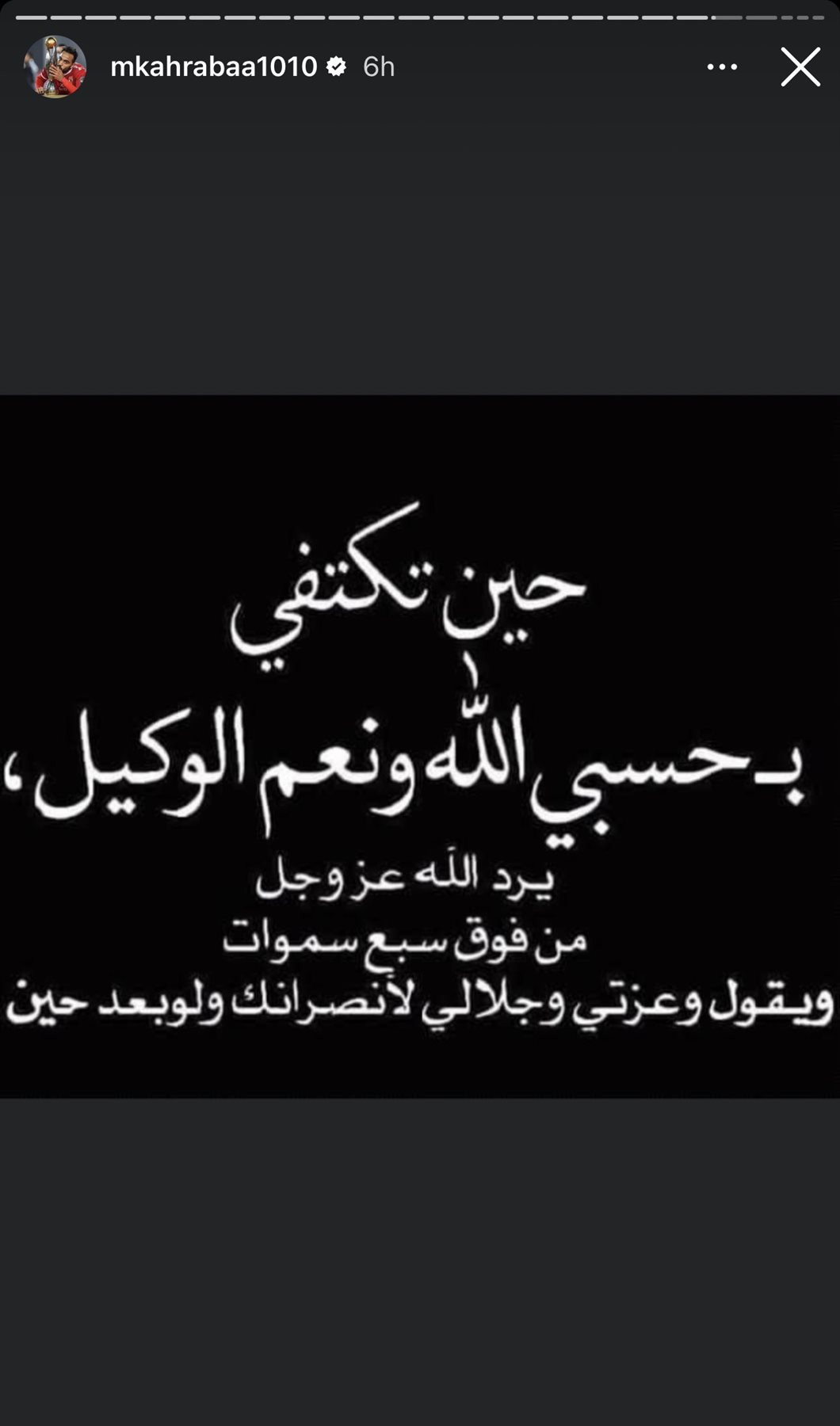 وكتب كهربا عبر خاصية “الاستوري”: “حين تكتفي بحسبي الله ونعم الوكيل، يرد الله عز وجل من فوق سبع سماوات ويقول وعزتي وجلالي لأنصرنك ولو بعد حين”.