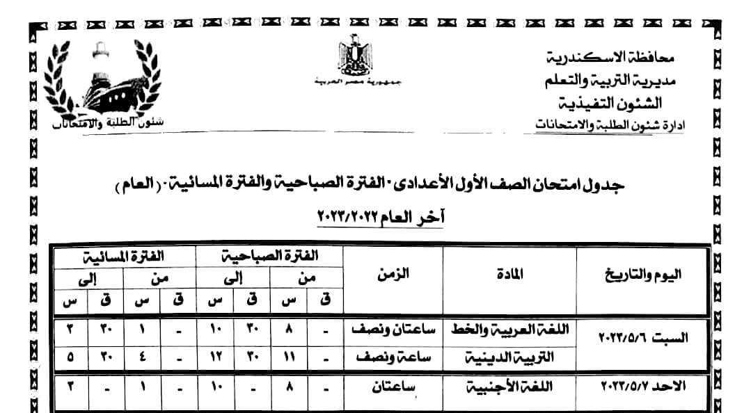 أعلنت مديرية التربية والتعليم بالإسكندرية، برئاسة الدكتور عربي أبوزيد، مواعيد امتحانات الفصل الثاني للشهادة الإعدادية والتي اعتمدها اللواء محمد الشريف محافظ الإسكندرية.