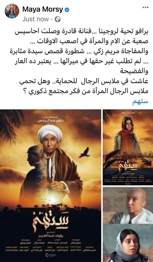 وكانت أشادت الدكتورة مايا مرسي رئيس المجلس القومي للمرأة بالنجمة روجينا ومسلسلها الجديد "ستهم" ، وقالت في منشور لها عبر حسابها الرسمي على موقع التواصل الاجتماعي فيس بوك، "برافو.. تحية لروجينا.. فنانة قادرة وصلت أحاسيس صعبة عن الأم والمرأة المصرية في أصعب الأوقات والمفاجأة مريم زكي شطورة.. قصص سيدة مثابرة لم تطلب غير حقها في ميراثها.. يعتبر ده العار والفضيحى عاشت في ملابس الرجال للحماية.. وهل تحمي ملابس الرجال المرأة من فكر مجتمع ذكوري؟".