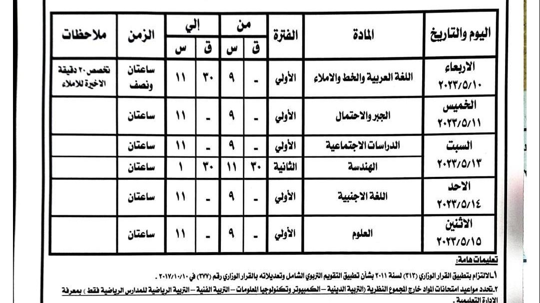 حيث أوضح الأستاذ محمد عبد التواب وكيل وزارة التربية والتعليم أن امتحانات الصفين الرابع والخامس الابتدائي تبدأ يوم 6 مايو وتستمر حتى 15 مايو ، فيما تبدأ امتحانات الصف السادس الابتدائي يوم 7 مايو وحتى 16 مايو ، بينما تبدأ امتحانات الصفين الأول و الثاني الإعدادي في الفترة من 10 إلى 15 مايو 2023، وأولى وثانية إعدادي " مكفوفين " في الفترة من 10 إلى 16 مايو، فيما تبدأ امتحانات الصف الثالث الإعدادي" عام ومهني ومكفوفين ونور أمل " يوم 18 مايو وتنتهى 24 من نفس الشهر