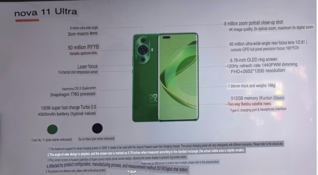 وفقا لتقرير من موقع gizmochina التقني المتخصص تم تسريب الجانب الأمامي من هواوي Nova 11 النسخة القياسية الأساسية في صور مسربة جديدة قبل إزاحة الستار رسميًا عنه، وقد وصف من قبل البعض بأنه قاتل iPhone 14 ، مع تصميمه الأنيق والحواف النحيفة وتصميم الكاميرا المثقوب في المنتصف.