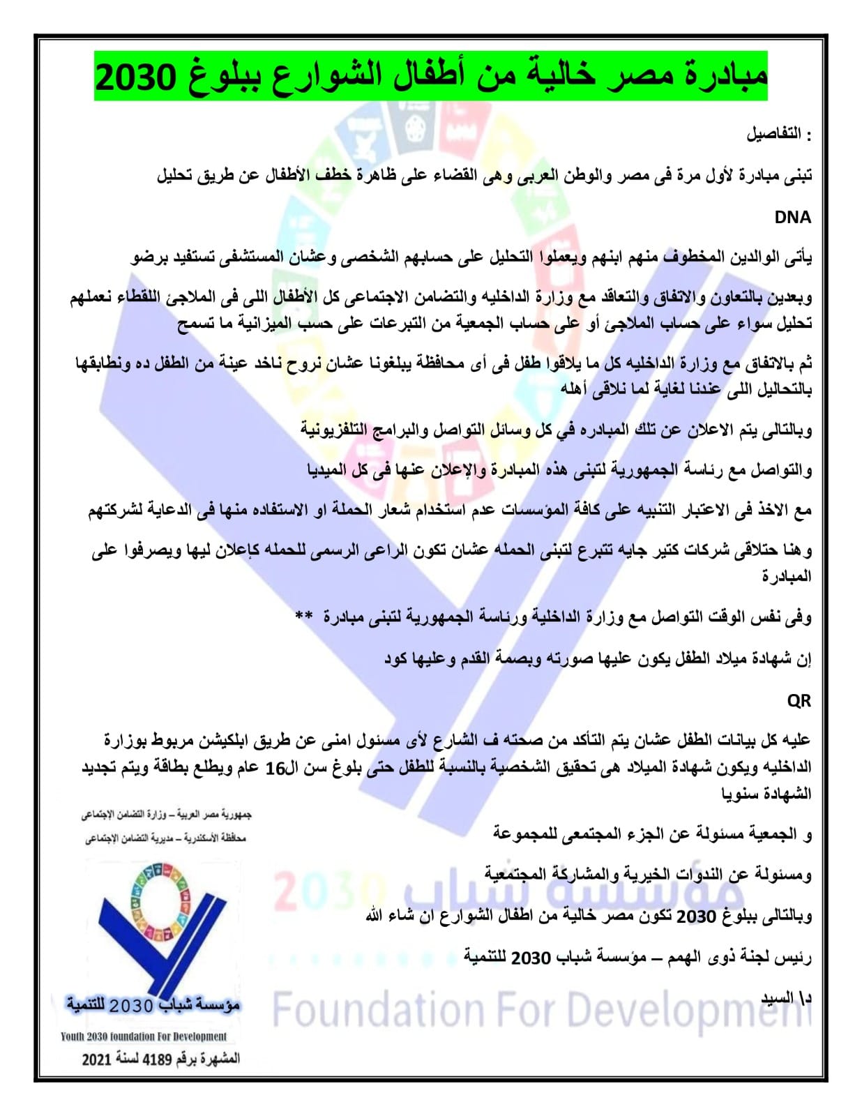 وياتابع البيان: "وبالاتفاق مع وزارة الداخلية كل طفل يتم العثور عليه يتم إجراء التحليل له ومطابقتها بالتحاليل للاهالي مع استخراج شهادة ميلاد للطفل المفقود تحمل صورته وبصمة القدم والكود".