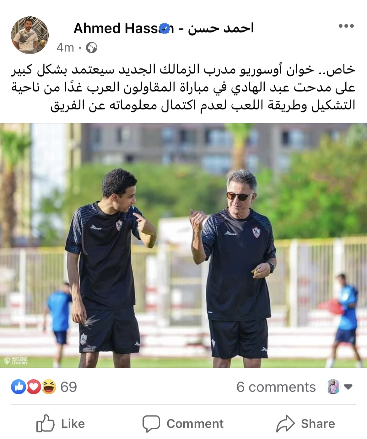 وكتب عبر فيسبوك: “خوان أوسوريو مدرب الزمالك الجديد سيعتمد بشكل كبير على مدحت عبد الهادي في مباراة المقاولون العرب غدًا من ناحية التشكيل وطريقة اللعب لعدم اكتمال معلوماته عن الفريق”.