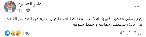 وكتب عامر العمايرة عبر حسابه الشخصي “فيسبوك”: “يجب على محمود كهربا البحث عن عقد احتراف خارجي بداية من الموسم القادم فى نادى يستطيع حمايته و حفظ حقوقه”.