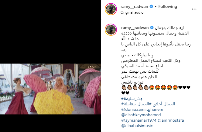 وكتب رامي رضوان: “ايه جمالك وجمال الاغنية وجمال مضمونها ومعانيها دددده ما شاء الله ربنا يجعل تأثيرها إيجابي على كل الناس يا رب ربنا يباركلك حبيبتي وكل التحية لصناع العمل المحترمين انتاج محمد أحمد السبكي كلمات يمن بهجت قمر الحان عمرو مصطفى توزيع نابلسي”.