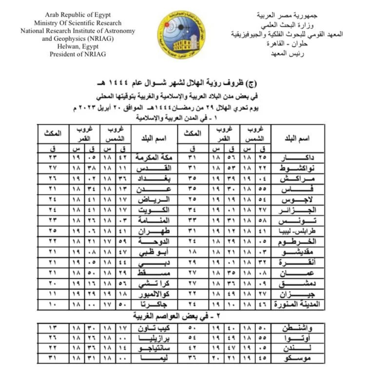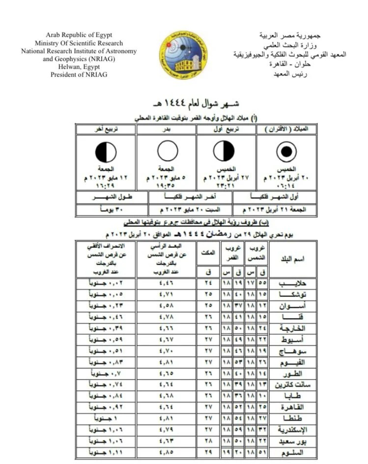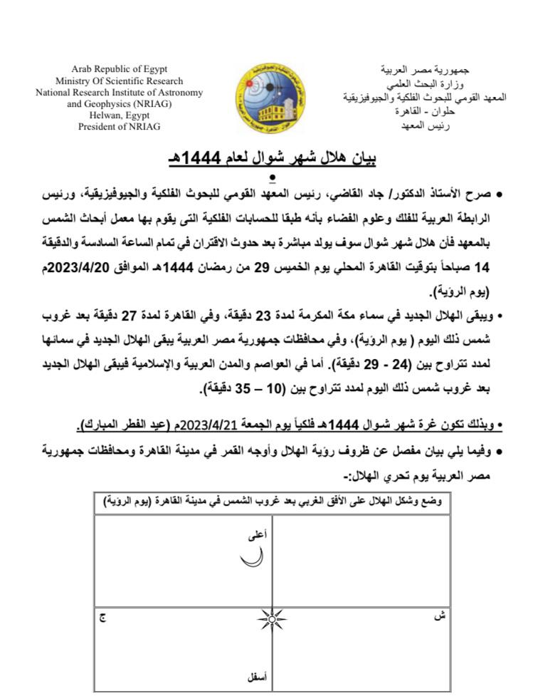 ويبقى القول الفاصل والأخير لدار الإفتاء المصرية، والتي تحدد موعد عيد الفطر 2023 في مصر، باستطلاع هلال شوال بعد غروب شمس يوم الخميس الموافق 29 رمضان 1444هـ و20 من إبريل الجاري 2023م.