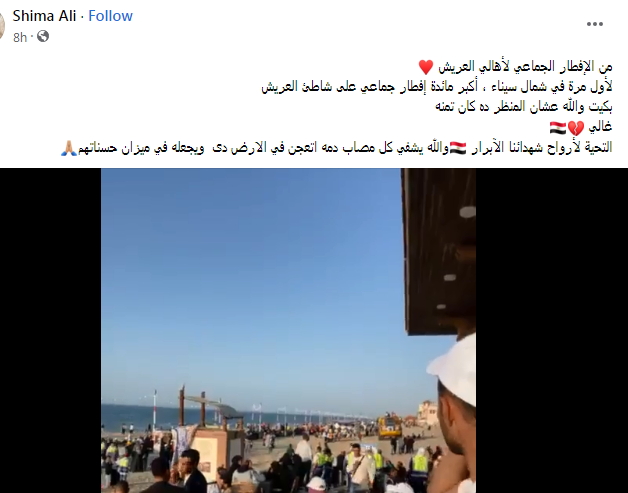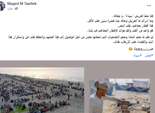 وتداول رواد مواقع التواصل الاجتماعي صورا عدة من إفطار الأسرة السيناوية، الذي نظم لأول مرة منذ سنوات طوال - بحسب ما قيل، بمحافظة العريش، وكان يضم تجمعا كبيرا من أبناء سيناء.
