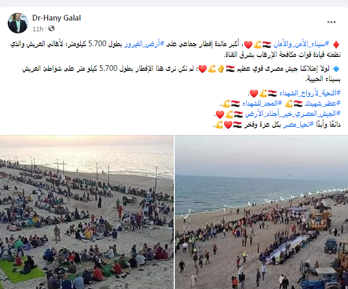وبدوره أكد اللواء هشام الخولي، نائب المحافظ، أن حفل الإفطار الجماعي علي ساحل البحر في العريش هو رسالة بأن سيناء آمنة، موجهًا التحية للقيادة السياسية وللقوات المسلحة علي الاهتمام بسيناء وأبنائها.