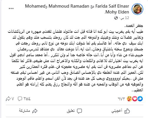 وأضافت فريدة سيف النصر: “رمضان حبيبي.شاء من شاء وأبى من أبى.. إنت حالة خاصة جدا لم ولن تتكرر.. أما محمد سامي أدعي أقول إيه.. يخرب بيت اختياراتك للأغاني والكلمات والكتابة والإخراج إنت مش طبيعي.. فاكر لما تكلمنا عن إني دماغي مضروبة فن.. إنت بقى إيه مضروبة معجونة فن.. على فكرة الممتازين كتير لكن.. المميز اللي عنده الخلطة دي بالإحساس الصادق وحب الناس.. من غير إحساس تبقى صنعة مش فن.. بحبكم أوي وبحب كل حد عنده فن بجد لأن الفن أسمى وأعلى ما في الوجود.. والموهبة هبة من الوهاب والمحبة من عنده هو الله والنجاح رزق يعني كله إرادته هو العلي العظيم”.
