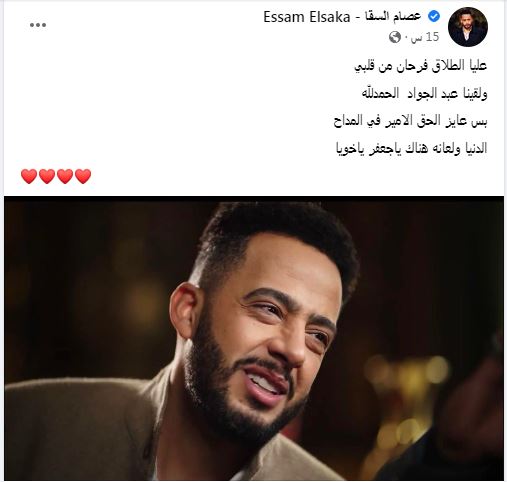 وقرر عصام السقا أن يخرج عن صمته ويرد على جمهوره عبر صفحته على موقع التواصل الاجتماعى فيسبوك : “عليا الطلاق فرحان من قلبي.. ولقينا عبد الجواد الحمدلله.. بس عايز الحق الامير في المداح والدنيا ولعانه هناك ياجعفر ياخويا”.