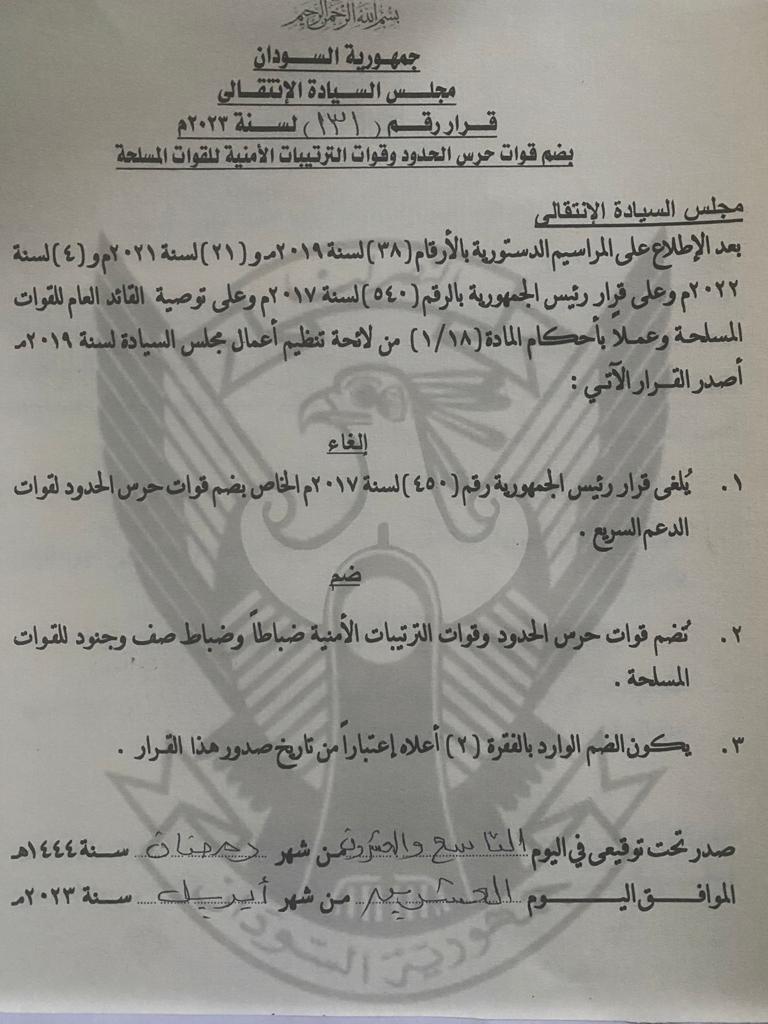 وأصدر رئيس مجلس السيادة الانتقالي القائد العام للقوات المسلحة السودانية، الفريق أول ركن عبدالفتاح البرهان، قرارا ألغى بموجبه قرار رئيس الجمهورية رقم 450 لسنة 2017 الخاص بضم قوات حرس الحدود لقوات الدعم السريع السابقة، وضم بموجب القرار الجديد بالرقم (131)، قوات حرس الحدود.