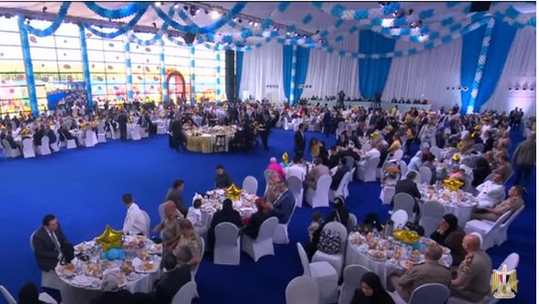 يشهد الرئيس عبد الفتاح السيسي الاحتفال بعيد الفطر المبارك، مع أبناء الشهداء، وقام الرئيس السيسي بمداعبة أحد أبناء الشهداء، قائلا: "تعالى جنبي هنا هنقعد ناكل مع بعض".