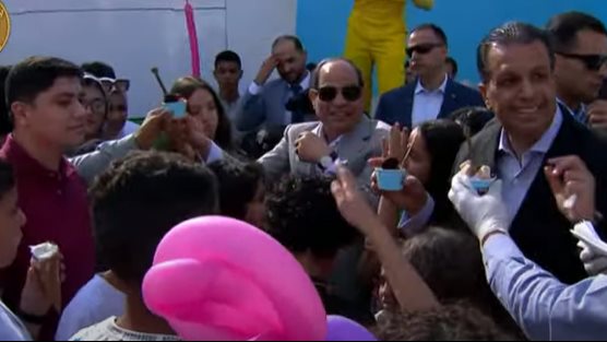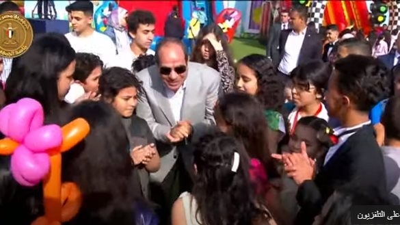 كما تجول السيسي في قاعة مركز المنارة، حيث إقامة احتفالية، عيد الفطر المبارك، رفقة طفلين، واضعًا يده في أيديهم.