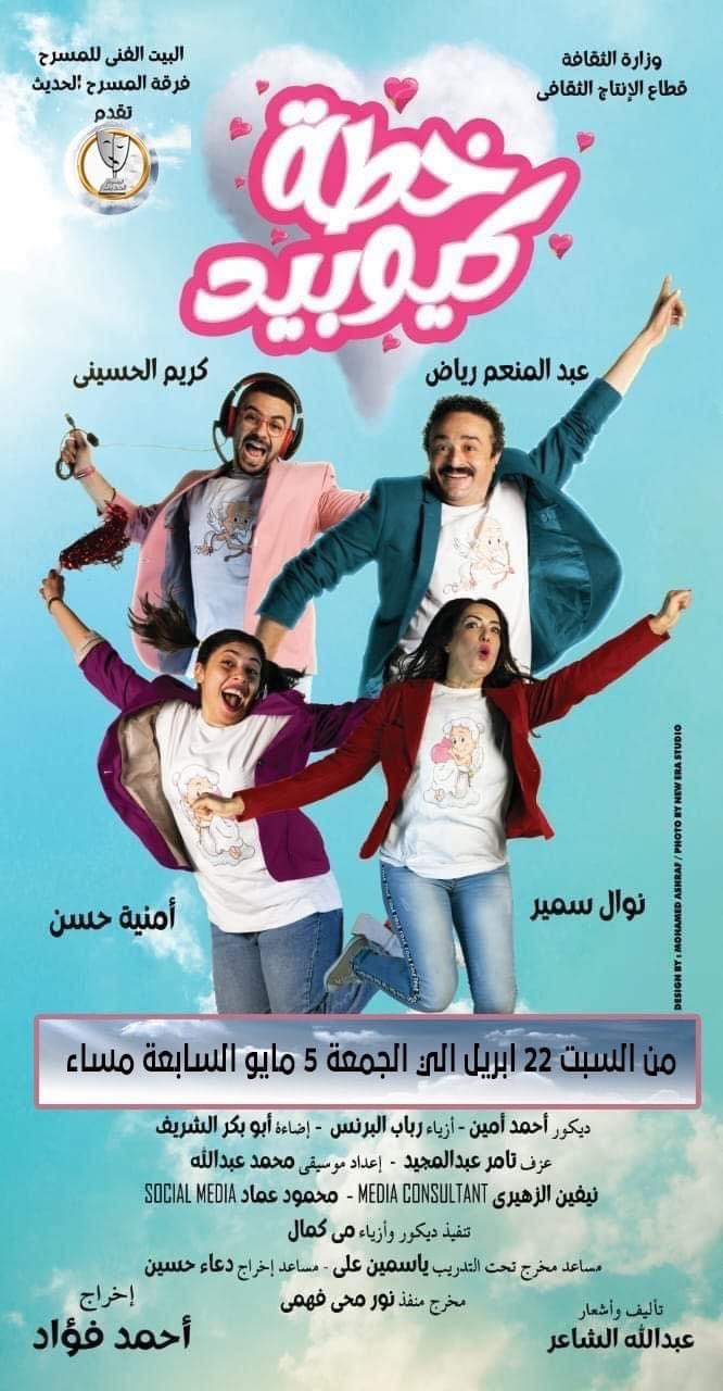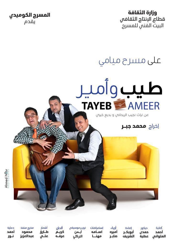 تفتتح فرقة المسرح الكوميدي العرض المسرحي الجديد " طيب و أمير " عن تراث نجيب الريحاني و بديع خيري، كتابة محمد الملاواني و إخراج محمد جبر، و ذلك في تمام الثامنة و النصف مساء على مسرح ميامي بشارع طلعت حرب، وذلك بعد تطويره وتحديثه، أما فرقة المسرح الحديث فتقدم عرضيها " خطة كيوبيد" من تأليف و أشعار عبد الله الشاعر و إخراج أحمد فؤاد ، و ذلك على مسرح السلام في تمام السابعة مساء، و عرض " "سيب نفسك " من تأليف مارك إيجيا و إخراج جمال ياقوت ، على قاعة يوسف إدريس بمسرح السلام في تمام الثامنة و النصف مساء .