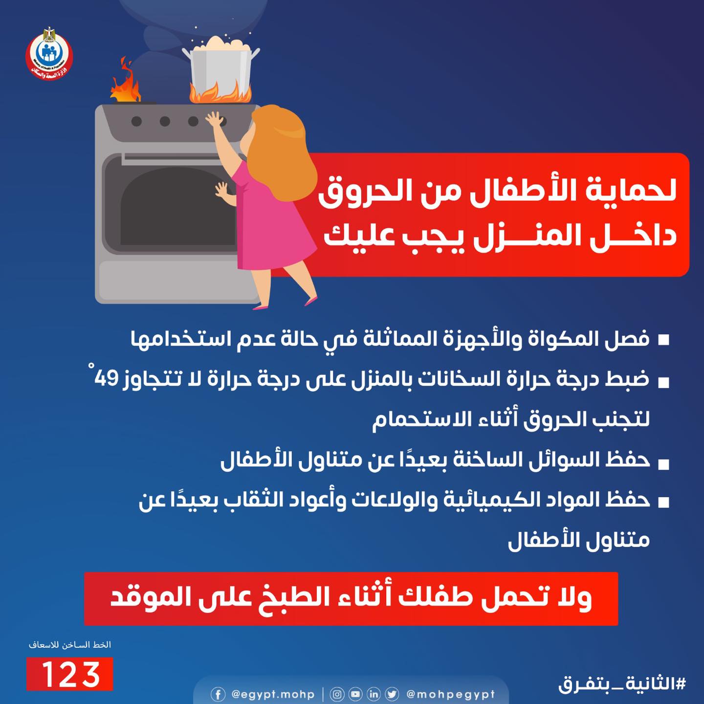 نشرت وزارة الصحة والسكان ، مجموعة من التعليمات لحماية الأطفال من الحروق داخل المنزل ، وذلك من خلال صفحتها الرسمية عبر موقع التواصل الإجتماعي .