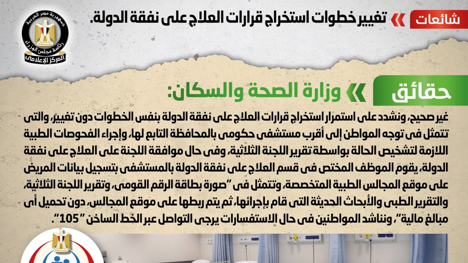 وعلي هذا فجميع مستشفيات الجمهورية سواء كانت حكومية أو خاصة او تتبع التأمين الصحي أو امانة المراكز المتخصصة أو المعاهد التعليمية أو الجامعات أو تتبع القوات المسلحة أو الشرطة يتم علاج المواطنين علي نفقة الدولة بها طالما التزمت المستشفي ببروتوكول التعاون بينها وبين المجالس الطبية المتخصصة.