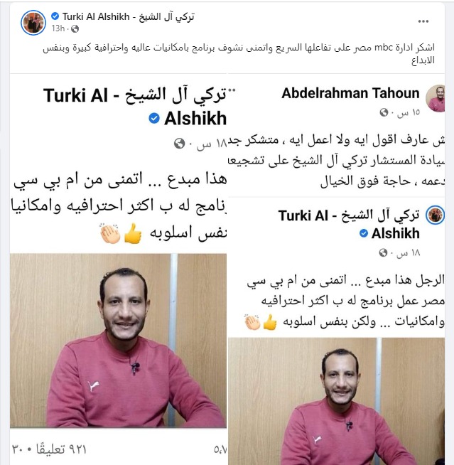 وطالب المستشار القائمون على قناة MBC مصر إنتاج له برنامج وكتب على صفحته بموقع فيس بوك:"الرجل هذا مبدع، اتمنى من ام بي سي مصر عمل برنامج له اكثر احترافيه وامكانيات، ولكن بنفس اسلوبه"، وبالفعل استجابت القناة لطلب آل الشيخ وتعاقدت مع عبد الرحمن طاحون لتقديم برنامج عبر شاشتها، ليقوم آل الشيخ بتوجيه الشكر لإدارة القناة خلال منشور جديد على فيس بوك كتب فيه :" اشكر ادارة mbc مصر على تفاعلها السريع واتمنى نشوف برنامج بامكانيات عالية واحترافية كبيرة وبنفس الابداع".