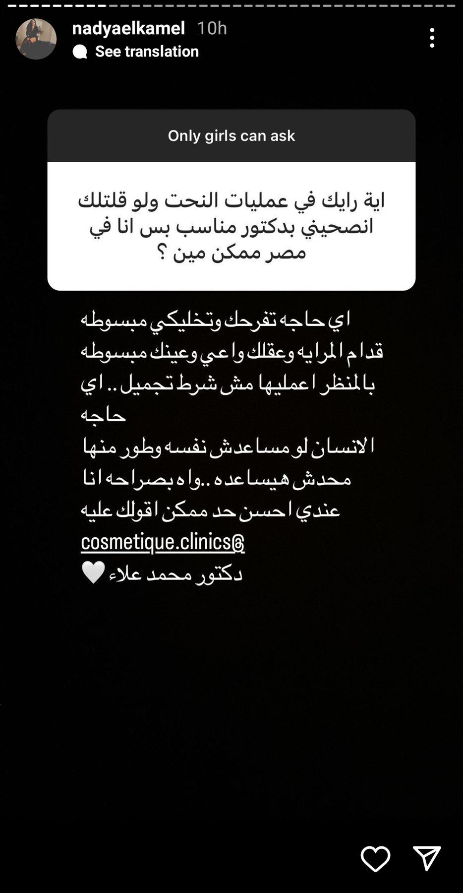 وجاء إلى طليقة أحمد الفيشاوي، سؤال من متابعة، عن عمليات نحت الجسم، فقالت المتابعة: «اية رأيك في عمليات النحت ولو قلتلك انصحيي بدكتور مناسب بس انا في مصر ممكن مين ؟».