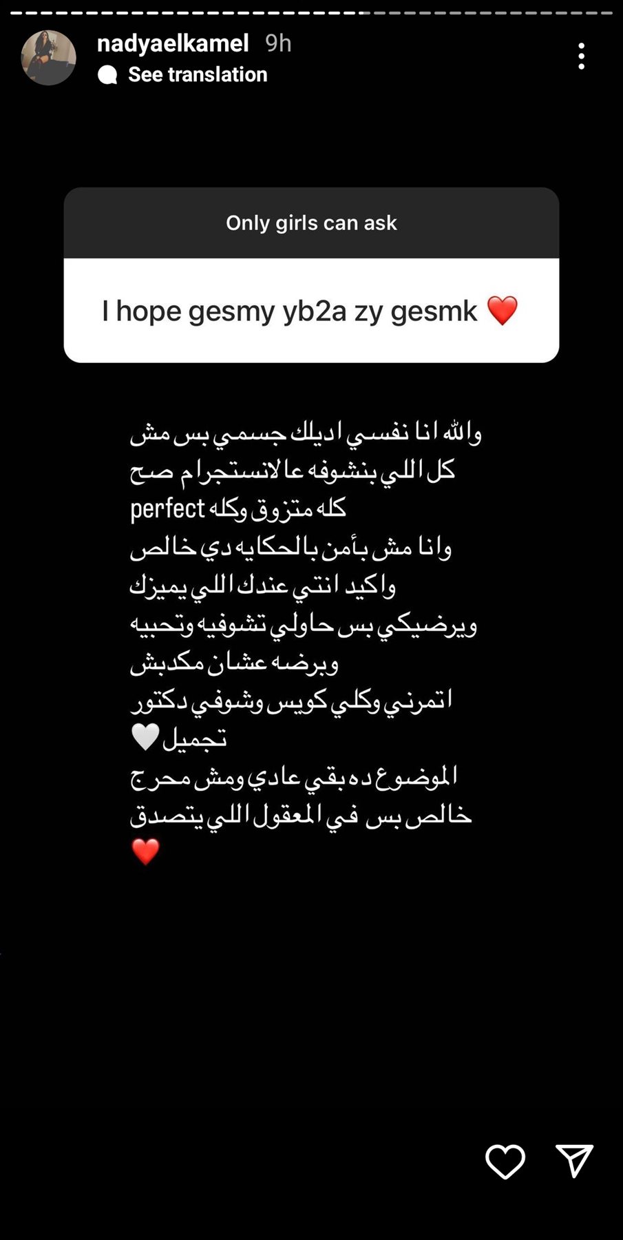 وقالت متابعة أخرى لطليقة الفيشاوي: «نفسي جسمي يبقى زي جسمك»، لترد عليها ندى الكامل، قائلة: « والله انا نفسي اديلك جسمي بس مش كل اللي بنشوفه عالانستجرام صح كله متزوق وكله perfect .. وانا مش بأمن بالحكايه دي خالص .. واكيد انتي عندك اللي يميزكويرضيكي بس حاولي تشوفيه وتحبيهوبرضه عشان مكدبش اتمرني وكلي كويس وشوفي دكتور تجميل الموضوع ده بقي عادي ومش محرج خالص بس في المعقول اللي يتصدق».