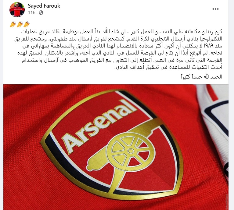 وكتب سيد فاروق عبر حسابه الشخصي على موقع التواصل الاجتماعي “فيس بوك":" كرم ربنا و مكافئته على التعب والعمل كبير.. إن شاء الله ابدأ العمل بوظيفة قائد فريق عمليات التكنولوجيا بنادي آرسنال الإنجليزي لكرة القدم".