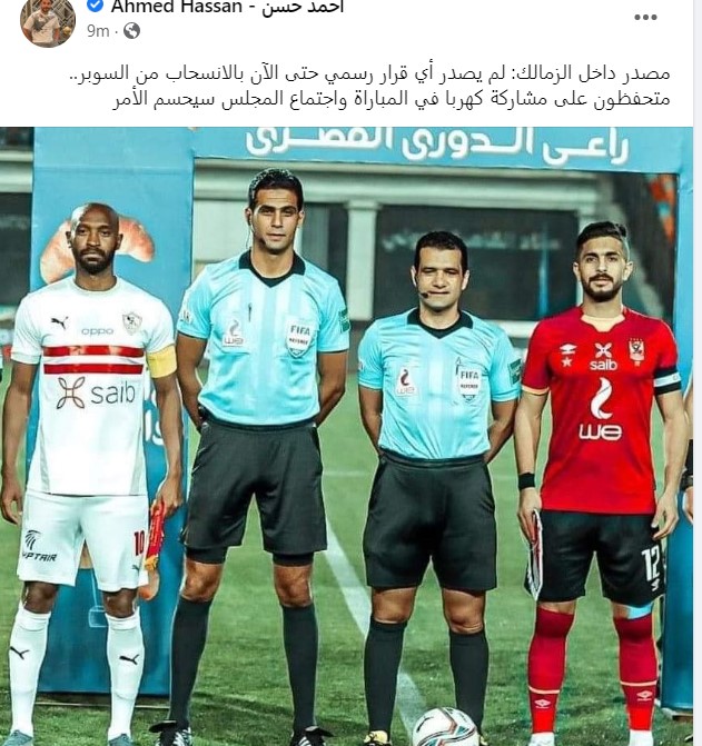 وكتب أحمد حسن عبر صفحته الشخصية على موقع التواصل الاجتماعي “فيس بوك”: "مصدر داخل الزمالك: لم يصدر أي قرار رسمي حتى الآن بالانسحاب من السوبر.. متحفظون على مشاركة كهربا في المباراة واجتماع المجلس سيحسم الأمر".