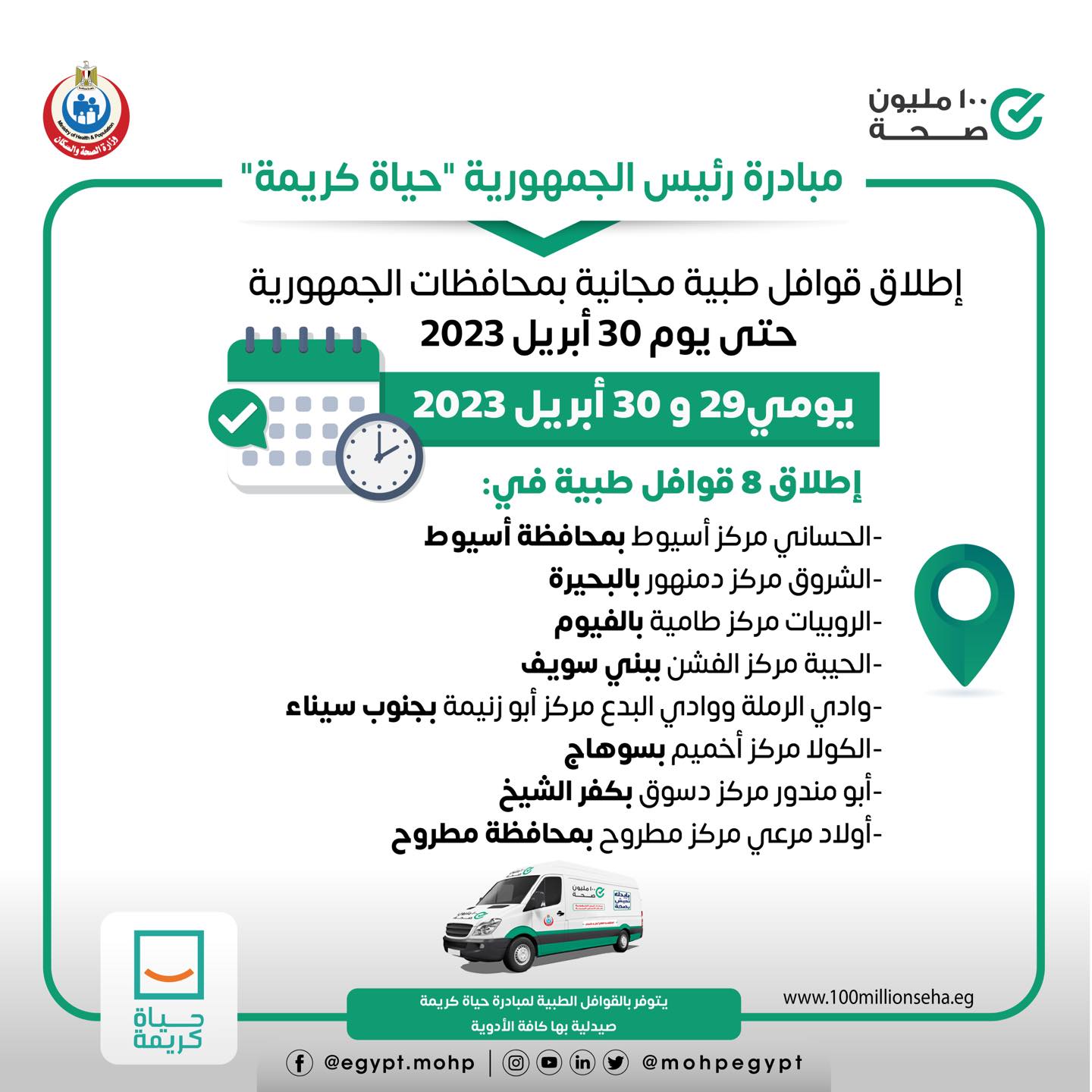 أعلنت وزارة الصحة والسكان، إطلاق 8 قوافل طبية ضمن مبادرة رئيس الجمهورية “حياة كريمة”
