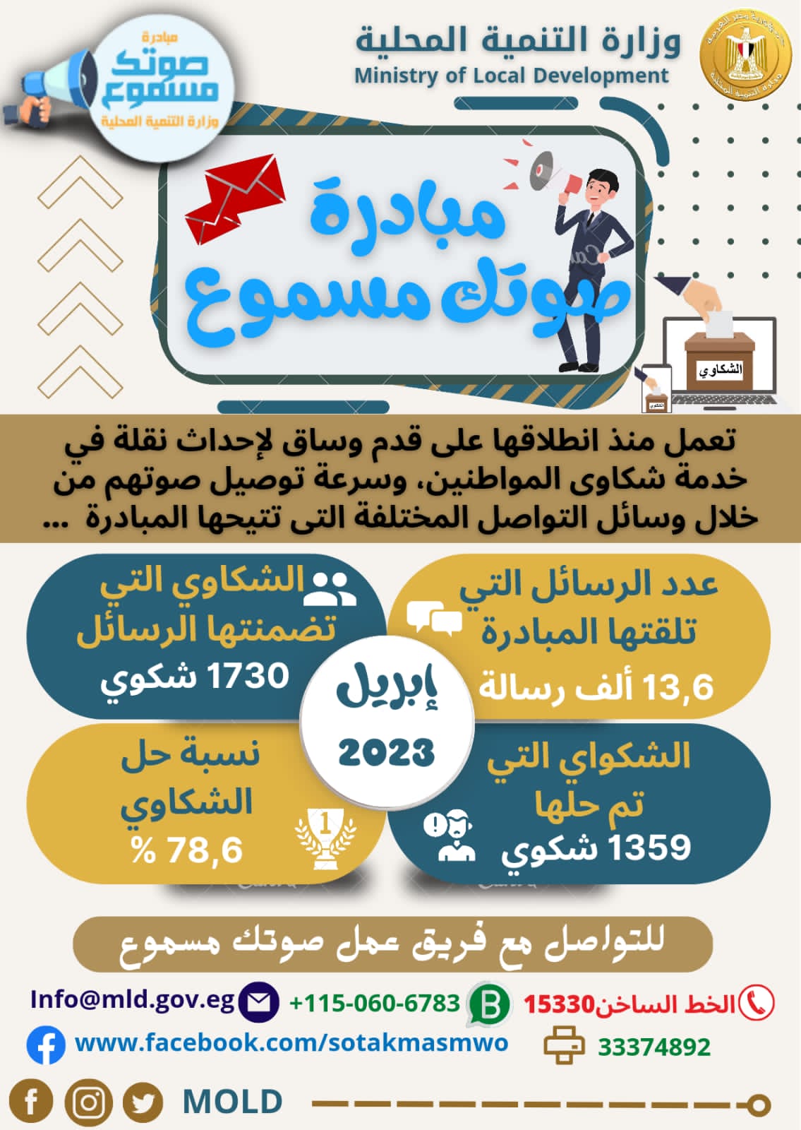 وكشف وزير التنمية المحلية عن نتائج مبادرة "صوتك مسموع" خلال شهر أبريل الماضى، حيث تلقت المبادرة أكثر من 13,6 ألف رسالة منها 1730 شكوى، تم الرد على 1359 شـكوى منها بنسبة 78.6% وجارى حـل 371 شكوى ، مشيرا إلى أن أكثــــــر الشكاوى هي الإشغالات وبلغ عــــددها 752 شكوى، ثم القـــــــمامة 647 شكوى، ومخالـــــفات البــناء 147 شكوى، ثم التعديات على الأراضي الزراعية واملاك الدولة 54 شكوى، وشكاوى الفسـاد وعـددها 7 شكاوى، اضـــــافة الى 123 شكوى خاصة بتعريفة الركوب وزيادة الاسعار وتم توجــــــــيهها للجـــــــهات المختصة بالمحافظات لاتخاذ اللازم.