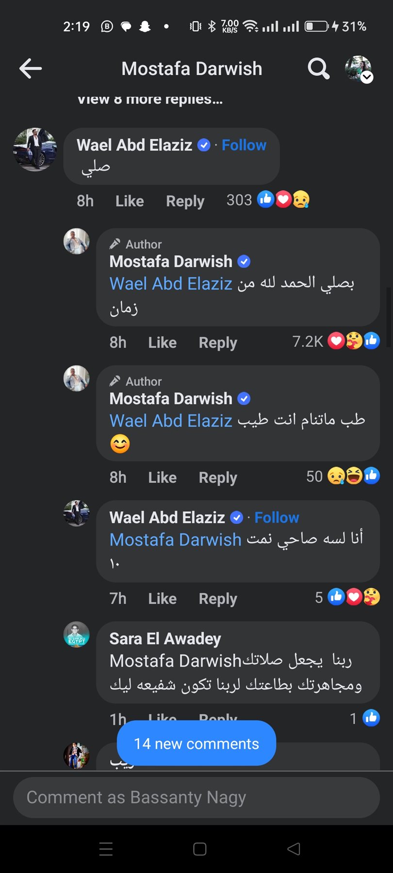 علق الفنان وائل عبد العزيز في أحد التعليقات للفنان مصطفي درويش في تغريدته الأخيرة عبر "فيسبوك" ، وكتب :"صلي".
